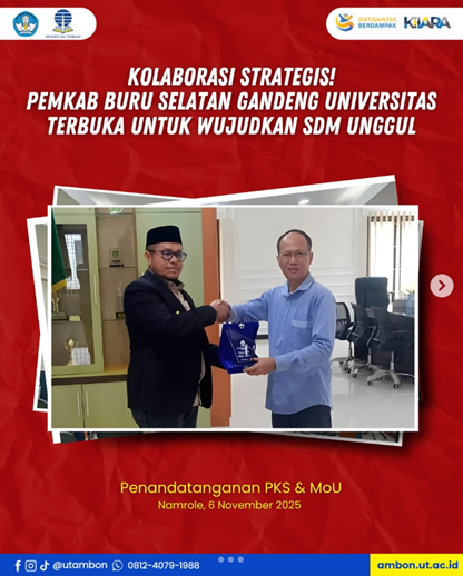 Pemerintah Kabupaten Buru Selatan dan Universitas Terbuka (UT) Ambon resmi menandatangani Memorandum of Understanding (MoU) dan Perjanjian Kerja Sama (PKS) sebagai langkah strategis dalam meningkatkan kualitas Sumber Daya Manusia (SDM), penguatan kelembagaan, dan mutu Tridharma Perguruan Tinggi di wilayah Buru Selatan. Penandatanganan berlangsung pada 5–7 November 2025 di Namrole sebagai bagian dari rangkaian kunjungan kerja UT Ambon.